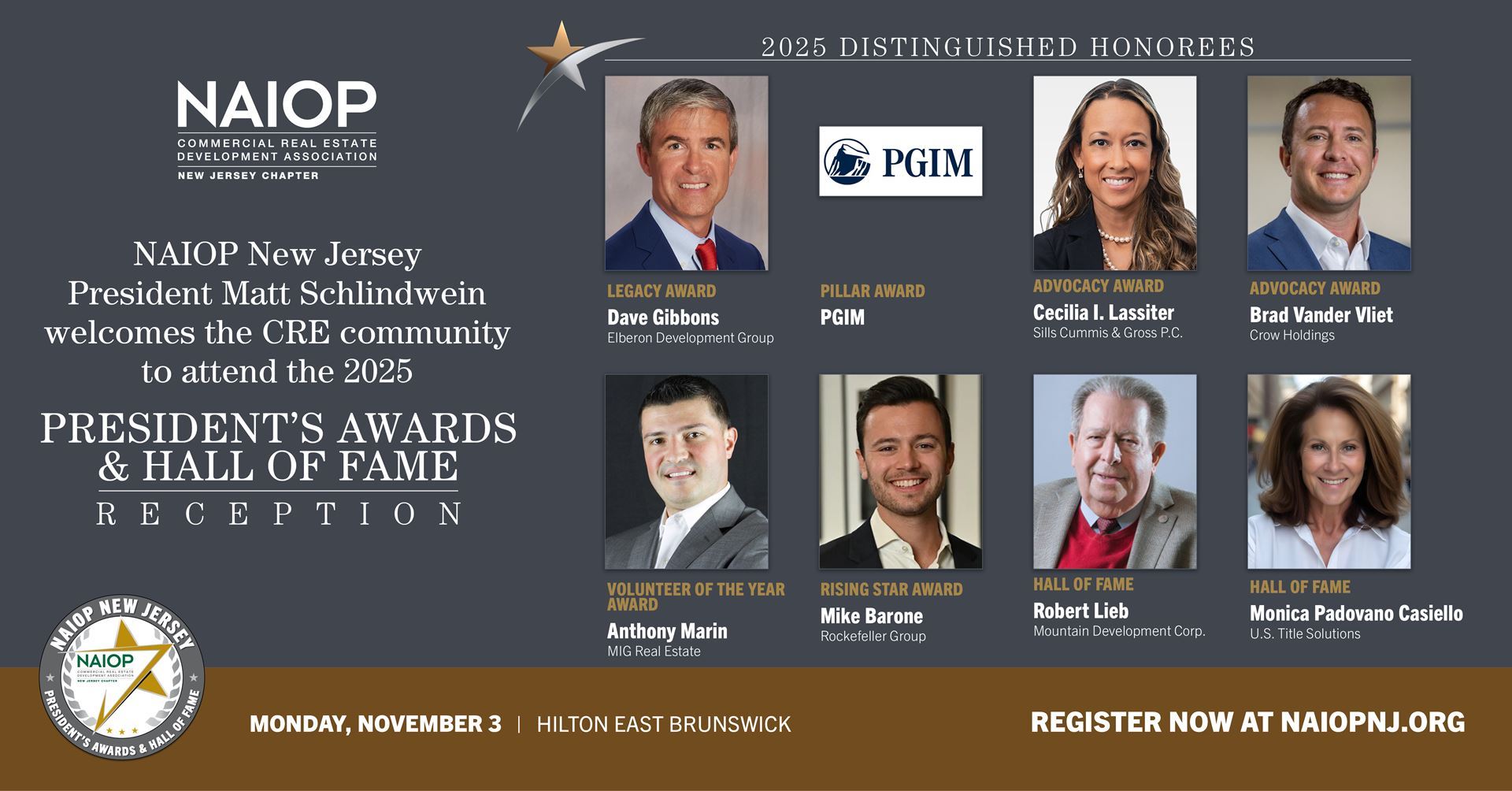More than a half-dozen commercial real estate industry leaders will take the stage next month as NAIOP New Jersey hosts its annual President’s Awards and Hall of Fame Reception.